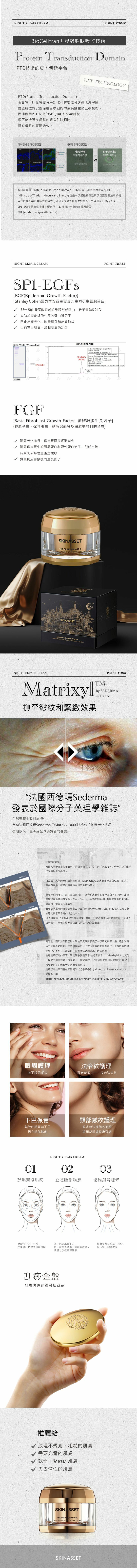 高濃度 Act-in Renaissance™ 70% 成分,深層滋養肌膚,提升保濕鎖水效果,使肌膚於睡眠中恢復彈性與光澤。搭配Matrixyl、Matrixyl 3000 三種胜肽 及 BioCellFactor 生長因子複合物,促進膠原蛋白增生,強化肌膚屏障,有效淡化細紋與皺紋,讓肌膚迎接煥采晨光。